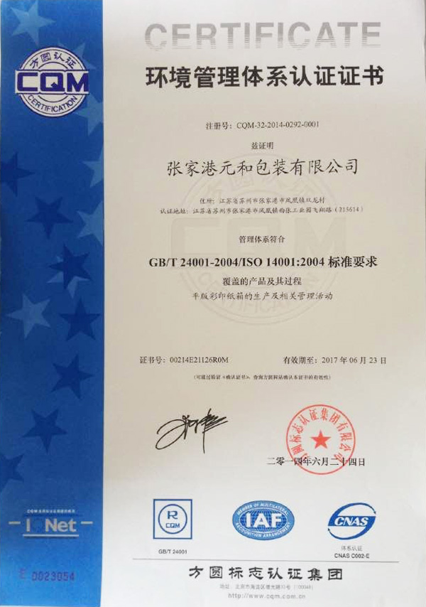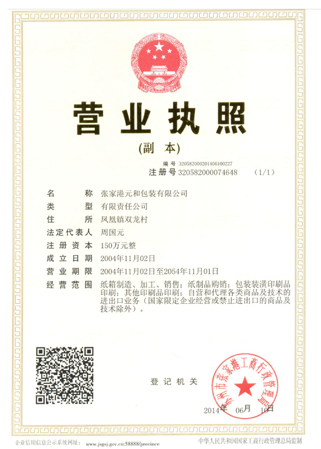 Zhangjiagang Yuanhe Packaging Co.,Ltd was founded in 1997, located at South Korea Industrial Park of Fenghuang town. West to Suyuzhang driveway, North to the along-river expressway, the traffic is very convenient. The company covers an area of 14,000m2, with a total investment of 40,000,000 Yuan.At present, the company possesses Heidelberg CD4 souvenir five-color offset printer, Gao Baoli RA145 five-color printing machine, Guangdong Caiyi full automatic mounted paper machine, Wencheng high-speed automatic water-based laminating machine, Wenchen high-speed glazing machine, Tianjing Youheng 1060 automatic film cut machine, Xuheng BRAUssE automatic film cut machine, Hongjing automatic folding and pasting machine, Youheng automatic folding and pasting machine and MK550Q automatic inspecting machine,Tokyo Wenhong automatic window patching machine, whole set of Founder carved dragon CTP system, Kodak 5065 CTP system and so on.